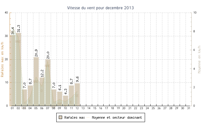 | min | max | moy | Vitesse (rafales) | Secteur | ||